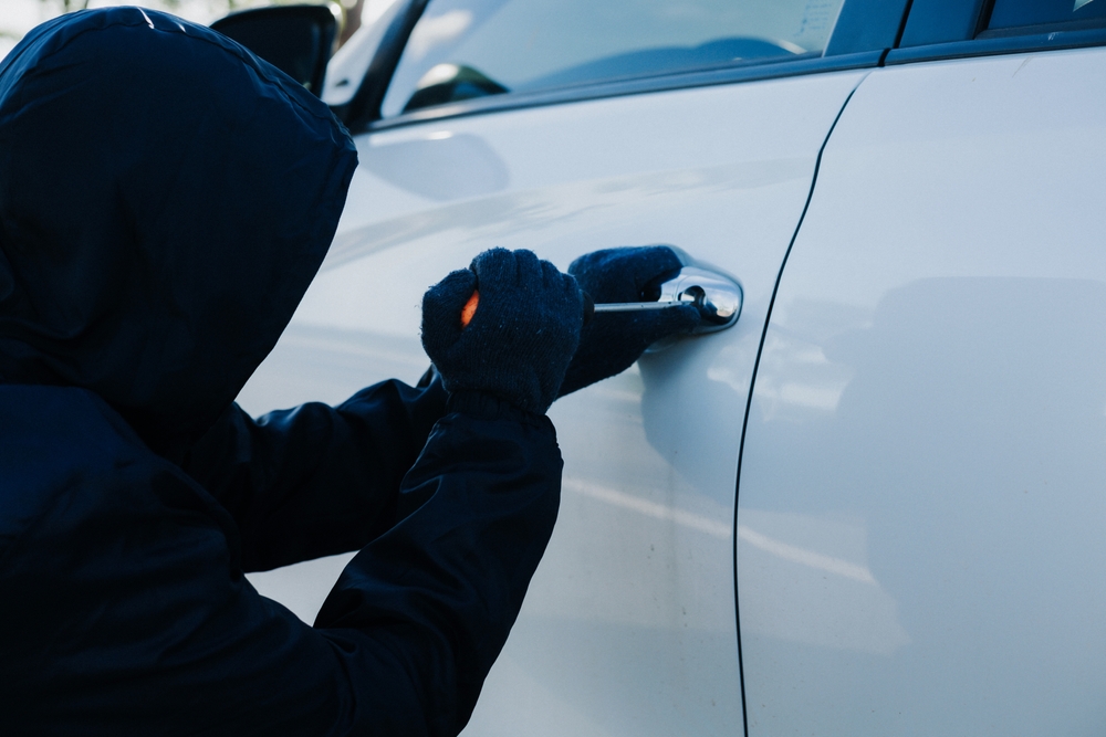 Zlodej v kukle sa pokúša vlámať do auta – dôležitosť ochrany vozidla pred krádežou.